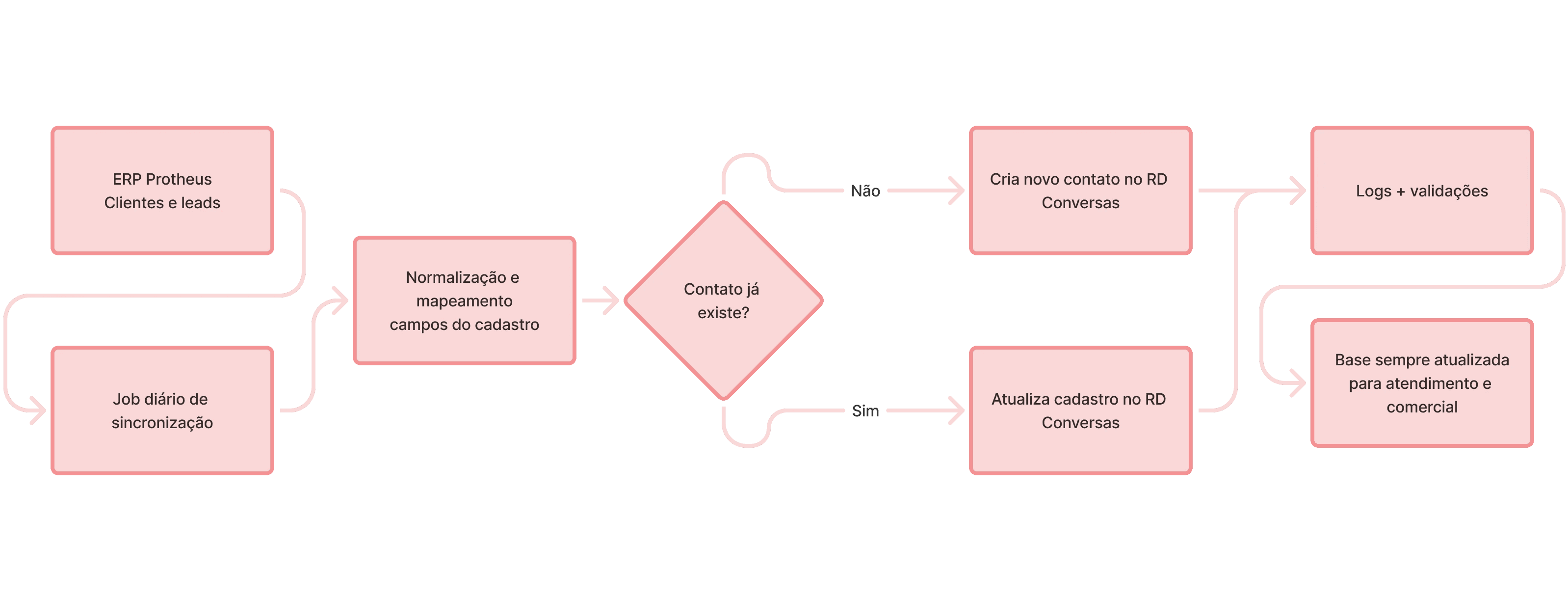 Na prática, o sistema executa uma sincronização diária: novos clientes cadastrados no Protheus são inseridos automaticamente no RD Conversas, e registros já existentes são atualizados com as informações mais recentes — garantindo consistência, completude e confiabilidade dos dados para atendimento e comercial.